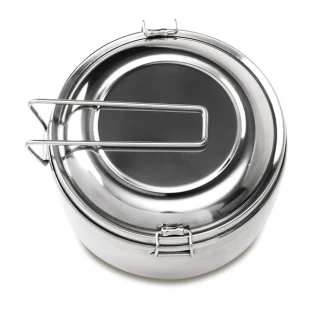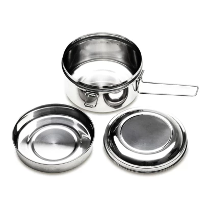 Dodatkowe informacje3-elementowy zestaw turystyczny ze stali nierdzewnej. W jego skład wchodzą: naczynie/garnek o pojemności 1l, mniejsze naczynie o pojemności 350 ml i pokrywka. Całość zamykana na klamry boczne.