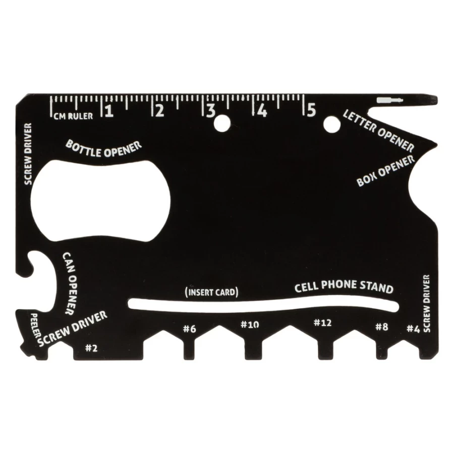 Narzędzie wielofunkcyjne w etui, 9 funkcji: linijka, mini wkrętak, otwieracz do kartonu, 2x wkrętak, klucze płaskie (#2, #4, #6, #8, #10, #12), podstawka pod telefon (karta nie jest dołączona), otwieracz do puszek, otwieracz do butelek